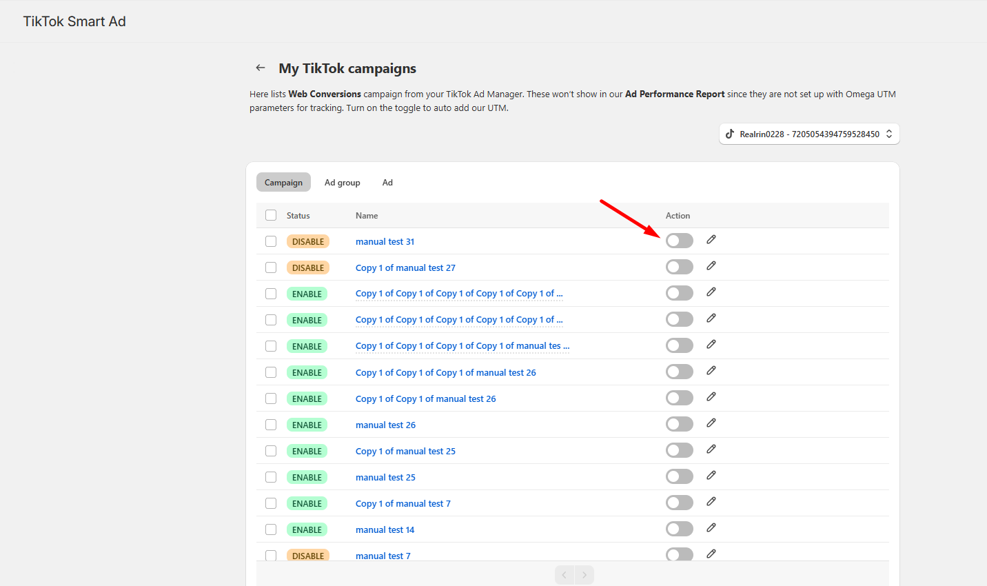 2. Campaigns (both Smart+ and Manual) attached with Omega UTM params.